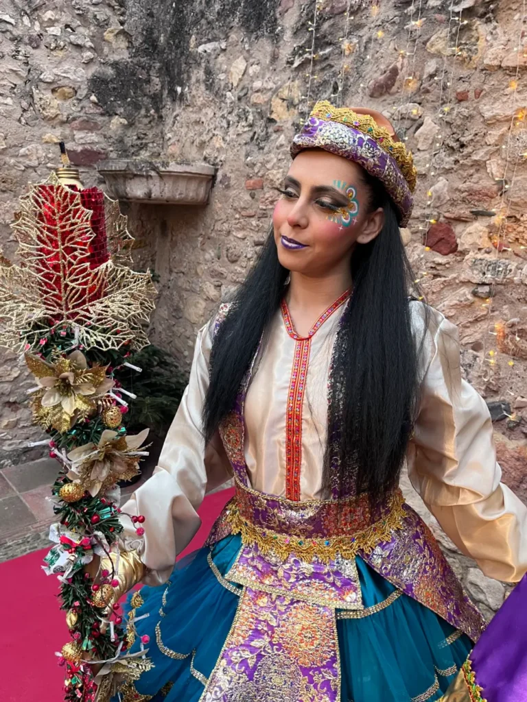 Actores vestidos de personajes navideños interactúan con los invitados, ofreciendo entretenimiento festivo único.
