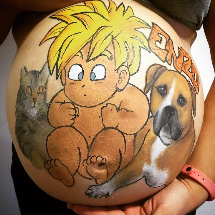 Se ofreció a venir a mi casa sin necesidad de yo moverme. Le dije que tenía claro que quería reflejar a mis animales junto con el que iba a ser mi hijo. Me dijo que nunca nadie le había pedido un dibujo tan personalizado, se trataba de hacer a mi perro y a mi gato. Aún así me dijo que estaba dispuesta y que para ella era un reto. Ella es Sandra una artista. Se portó como nunca. Simpática, cariñosa, atenta … Tardó casi dos horas .. y cuando acabó me quedé sin palabras! Era justo lo que le pedí. No quería quitarme el dibujo de mi barriga jamás. No me arrepiento de haber tomado aquella decisión, de cancelar la cita con la agencia, dicen que las cosas pasan por algo y tuve que contarle a mi amiga que me pintaría la barriga para que ella me llevase hasta Sandra!